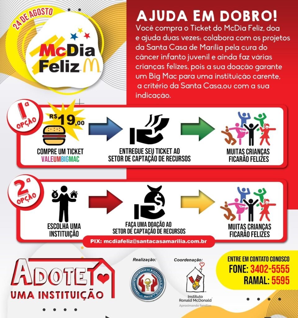A APCD Marília estará encaminhando os valores dos ticket’s do Mc Dia Feliz, doados na modalidade ajuda em dobro, para a Santa Casa de Marília, que destinará para as entidades cadastradas.