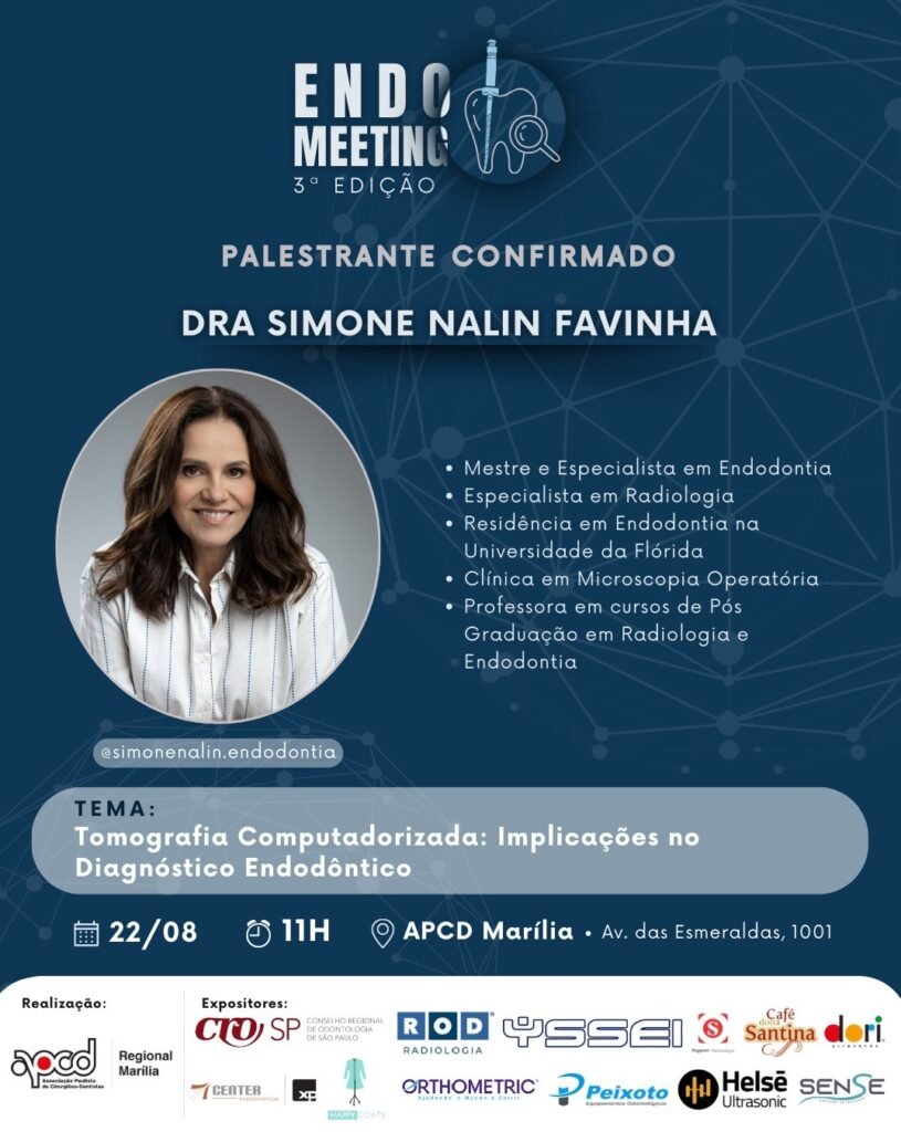 Com 30 anos de experiência clínica e atuação ativa no Conselho Científico da APCD Marília, Dra. Simone trará uma abordagem objetiva, fundamentada e clínica sobre casos reais em que a tomografia fez a diferença para o sucesso do tratamento. A palestra é voltada a profissionais que desejam integrar a tomografia como ferramenta estratégica de diagnóstico e planejamento em endodontia, com segurança e embasamento técnico.
