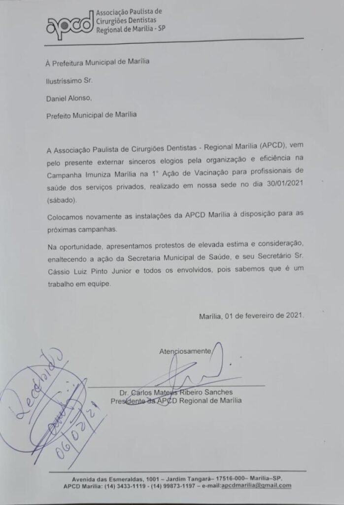 O Presidente da APCD Marília Dr. Carlos Mateus Ribeiro Sanches esteve presente na 2° ação de imunização e entregou em mãos ao Prefeito Daniel Alonso e ao Secretário de Saúde Cassio Pinto um ofício externando sinceros elogios pela organização e eficiência na Campanha Imuniza Marília na 1° Ação de Vacinação para profissionais de saúde dos serviços privados, realizado em nossa sede no dia 30/01/2021 (sábado).